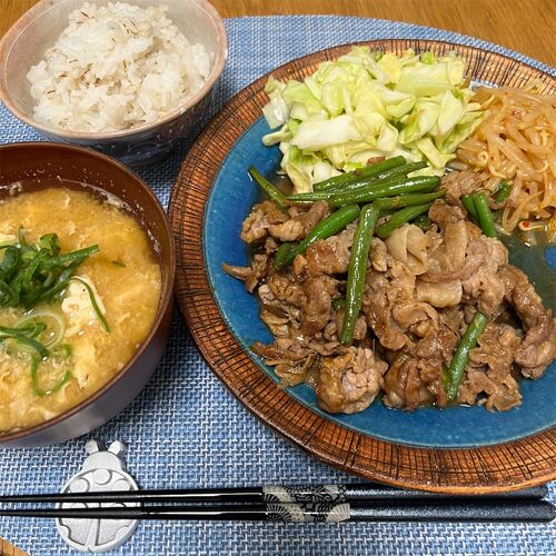 けーこ手料理♡ ↓ 生姜焼き【豚肉 いんげん】 ↓ あごだし浅漬け【キャベツ】 ↓ おつまみもやし ↓ 味噌汁【木綿豆腐 玉子】 ↓ 押し麦入り白米 (o^^o)v